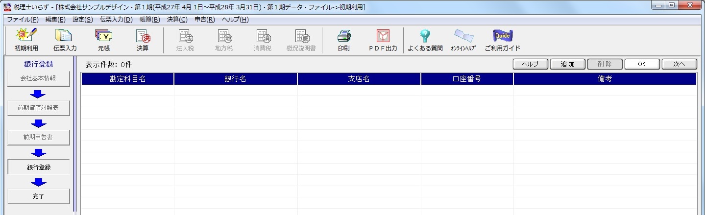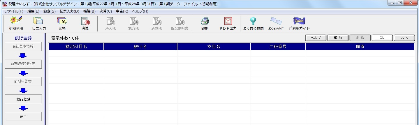預金通帳と対応する勘定科目名、銀行名、支店名、口座番号を入力して、登録します。