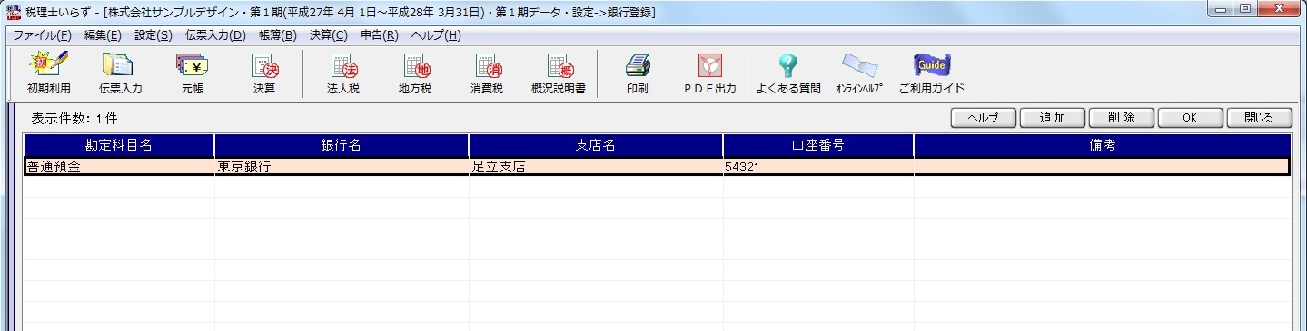 をしておくと、預金科目と関連付けられた金融機関名、支店名等が法人税申告書の
