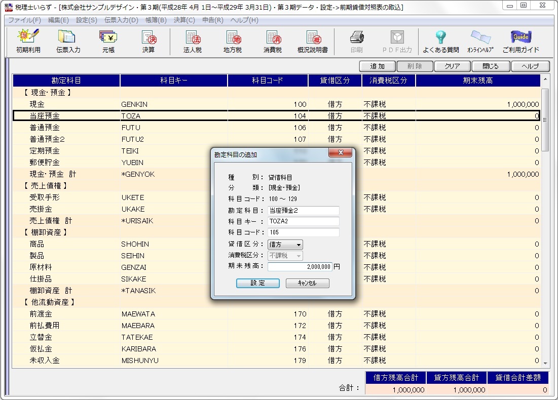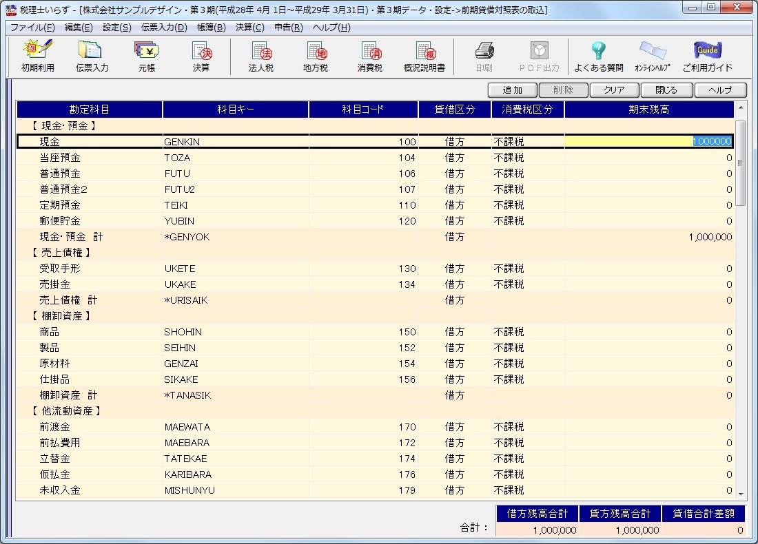 登録作業終了時に、右下の借方残高合計と、貸方残高合計が一致していることを確認して