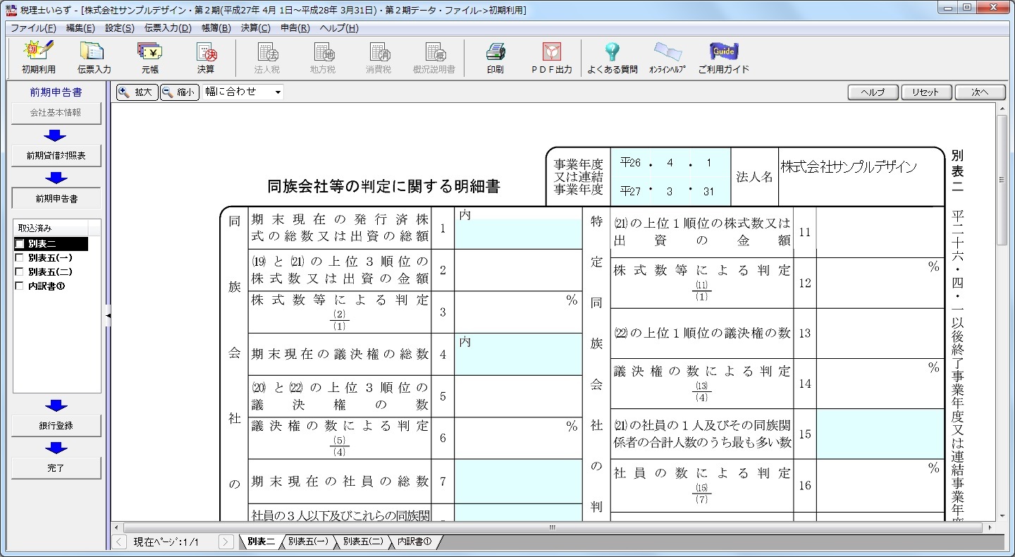 「前期申告書の取込」で、すべての別表、内訳書を入力後、