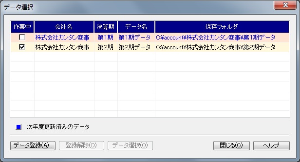 登録されている会計データの一覧が表示されます。次年度更新済みのデータは青色で表示されています。