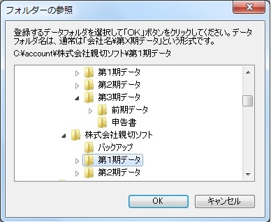 「データ登録」ボタンをクリックすると、フォルダの参照ダイアログが開くので、会計データが登録