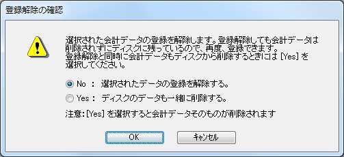 注意: 「Yes」の場合、会計データそのものが削除されますので、操作は慎重に行ってください。