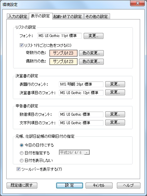 元帳や仕訳日記帳などのリスト(一覧)画面で使用する文字フォントを設定