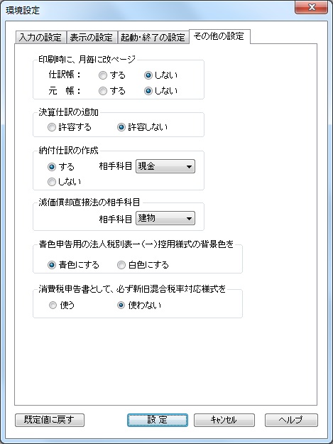 「表示の設定」、「その他の設定」は、決算期毎の会計データ固有の設定になっています。