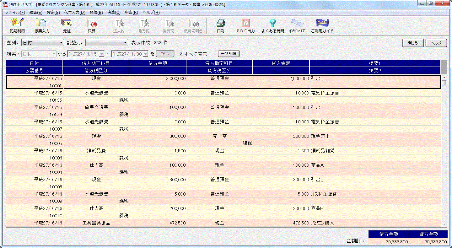 これまでに入力されたすべての仕訳が一覧画面に表示されます。