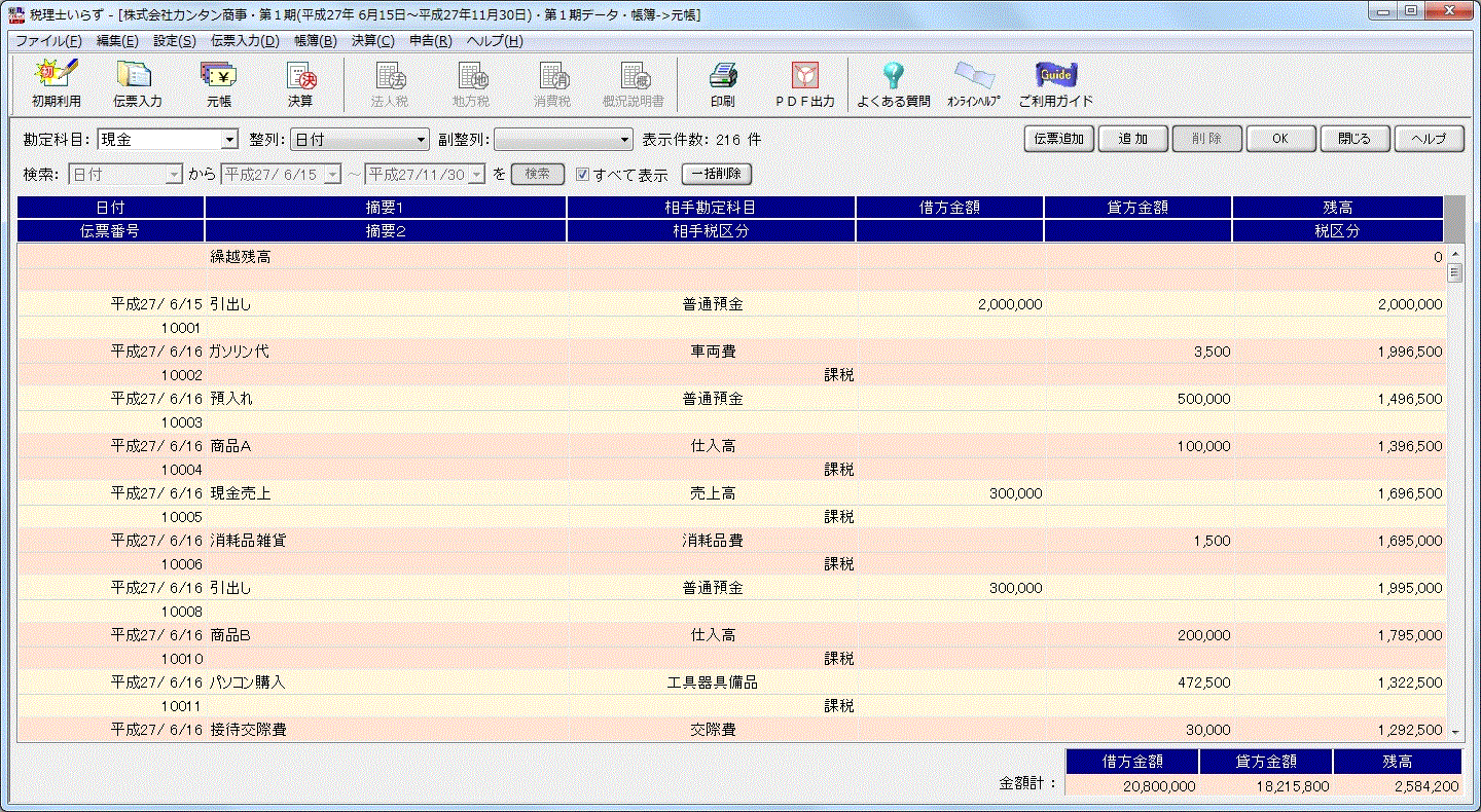 画面の下部には、借方金額貸方金額残高が表示されます。