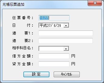 「追加」ボタンをクリックすると、次の元帳伝票追加ダイアログが表示され、仕訳を追加