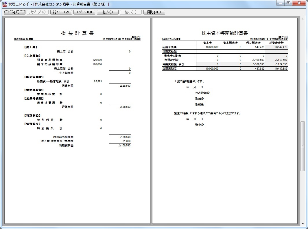 決算書の確認画面は、下図のような印刷プレビュー画面になります。(2ページ表示の時)