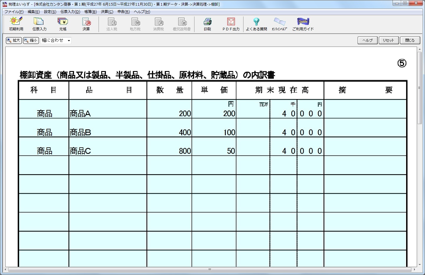 「税理士いらず」の棚卸処理は、実地棚卸のみサポートしていますので、期末現在の商品等の金額を