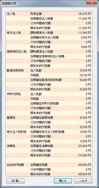 この税額集計表は、「決算書作成」ダイアログの「税額集計表」ボタンをクリックして、いつでも再確認