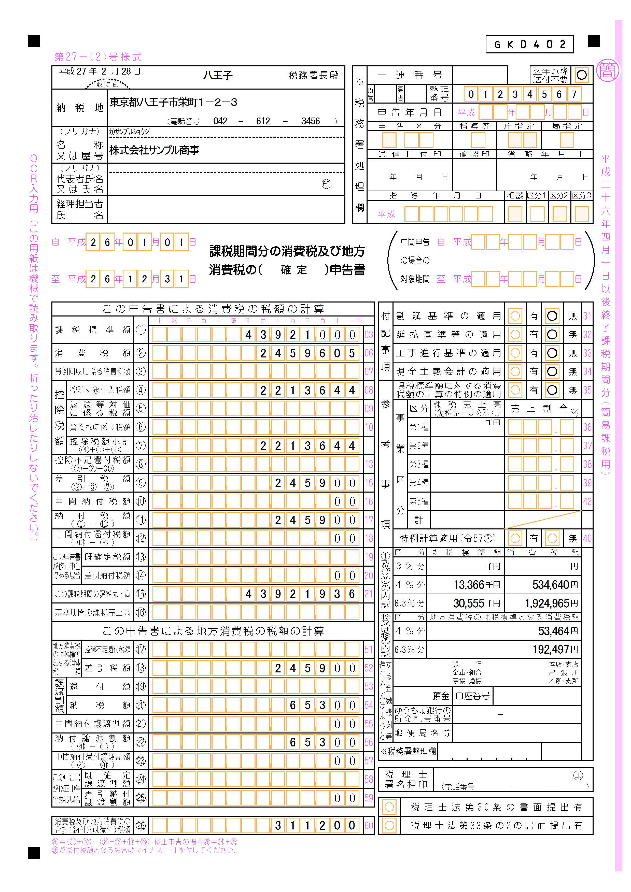 消費税申告書のサンプルイメージ