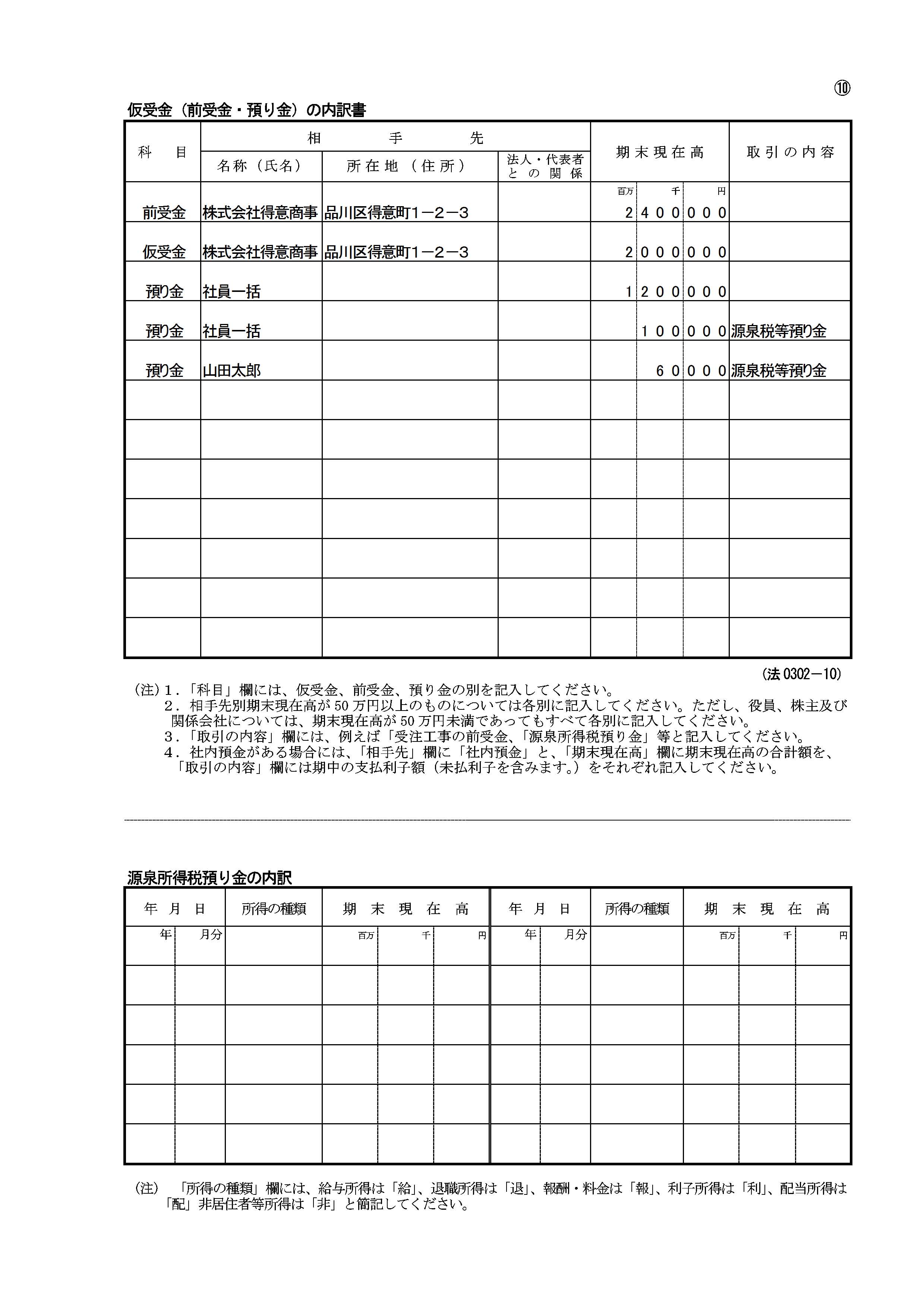 法人税申告書の内訳書サンプルイメージ